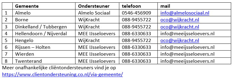 Cliëntondersteuning moet onafhankelijk zijn, vinden we. Daarom staan voor u als cliënt de vrijwilligers klaar van Almelo Sociaal. (klik hier voor alle andere gemeenten)